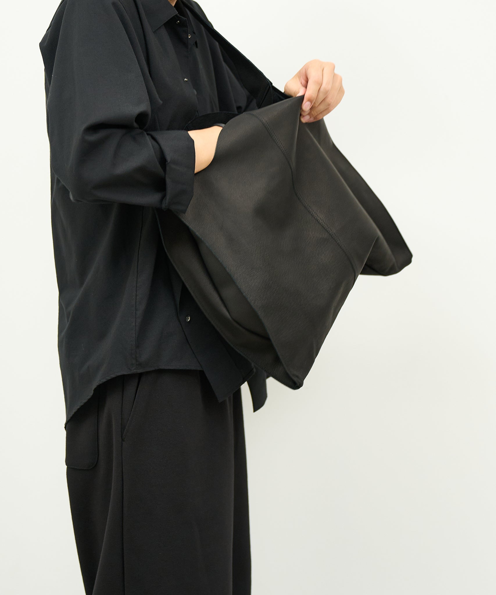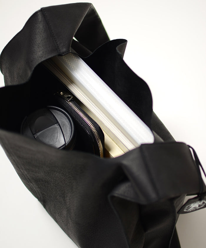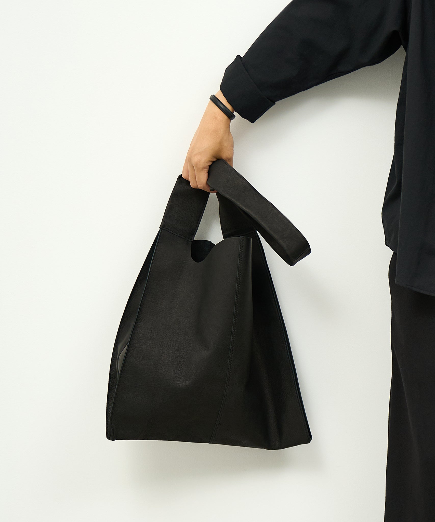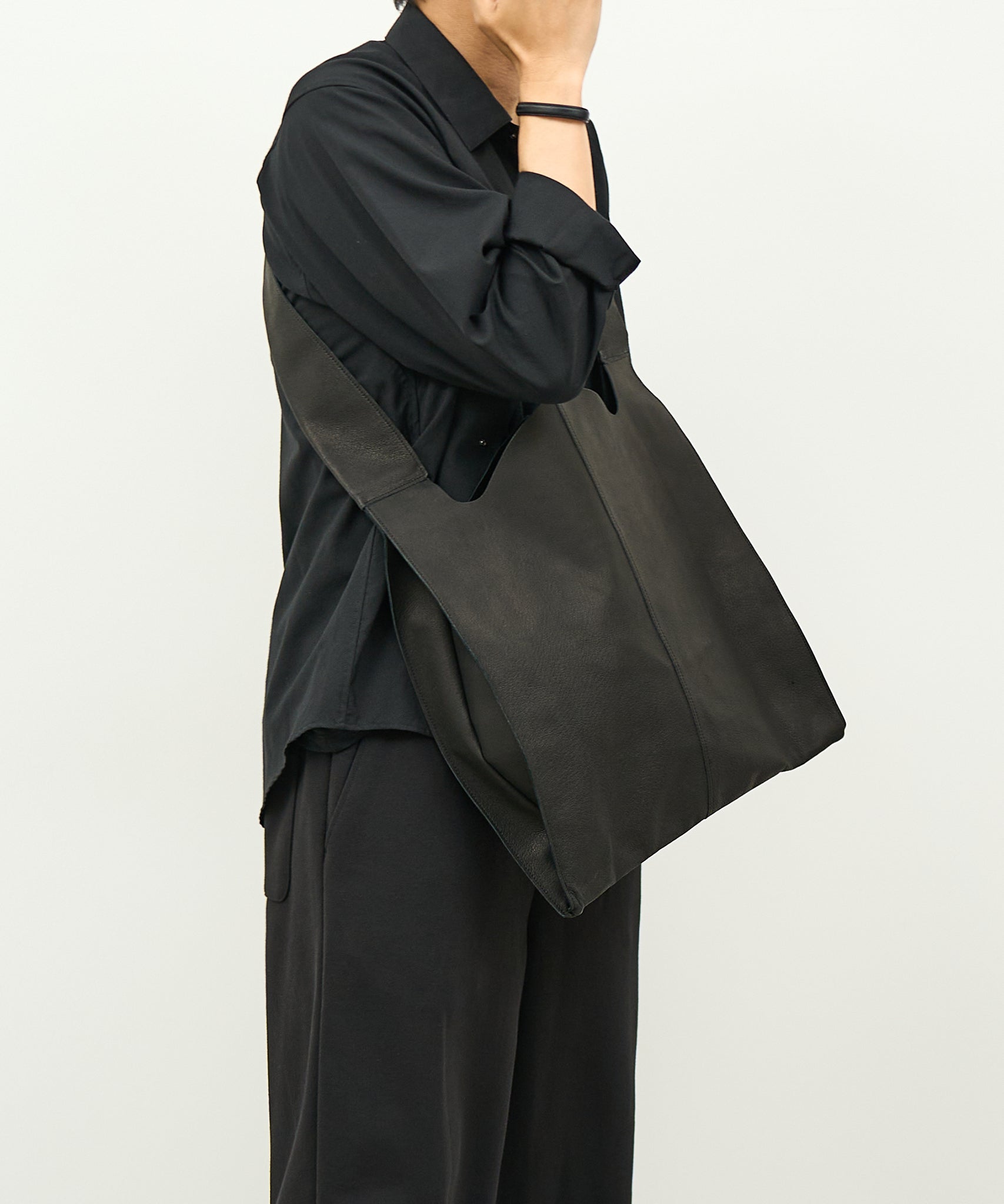 以日常生活中極為熟悉的購物袋為靈感,設計成單肩款式的皮革肩背包