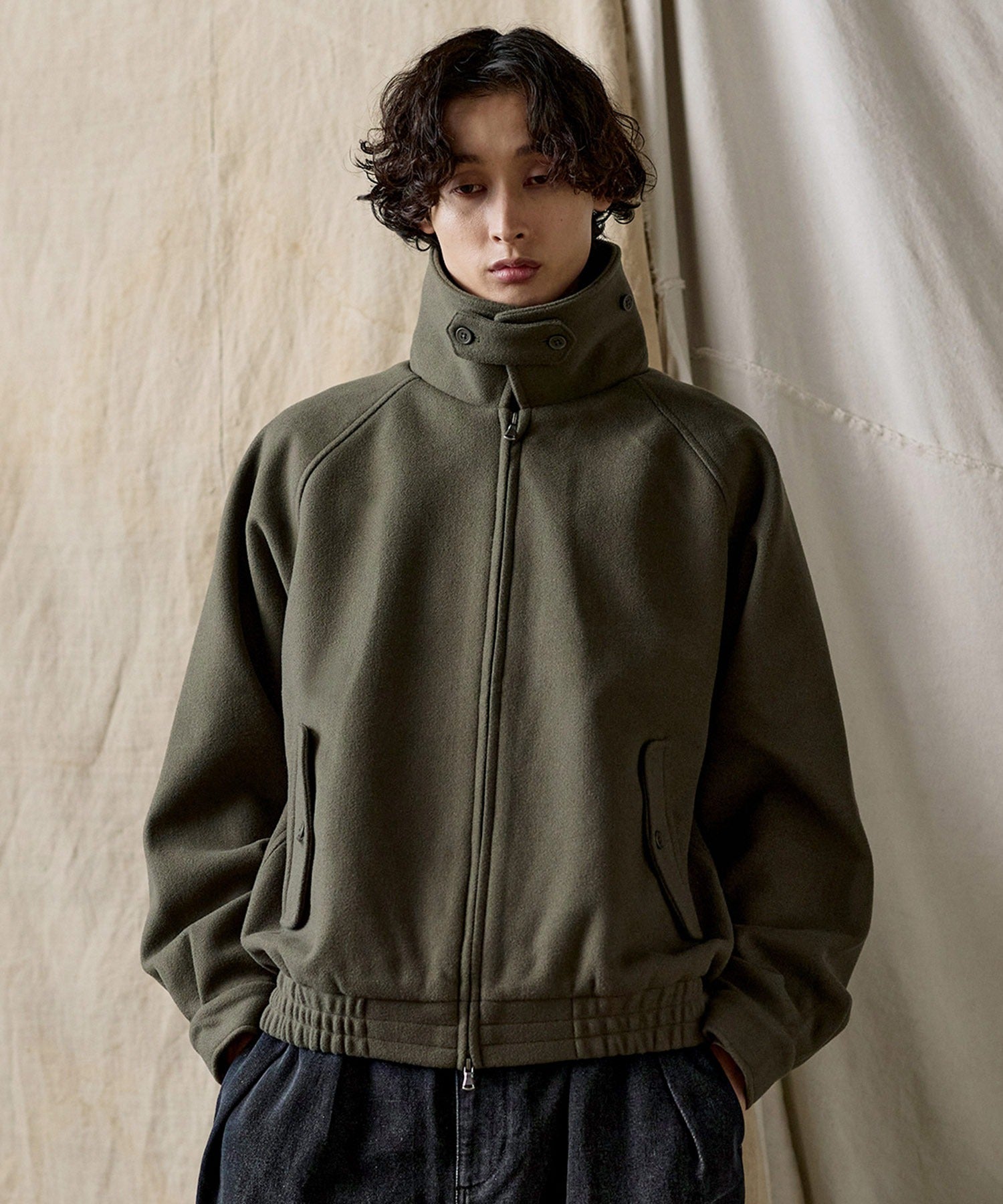 商品特色:中長款、無帽、寬鬆版型、拉格蘭袖、立領扣帶