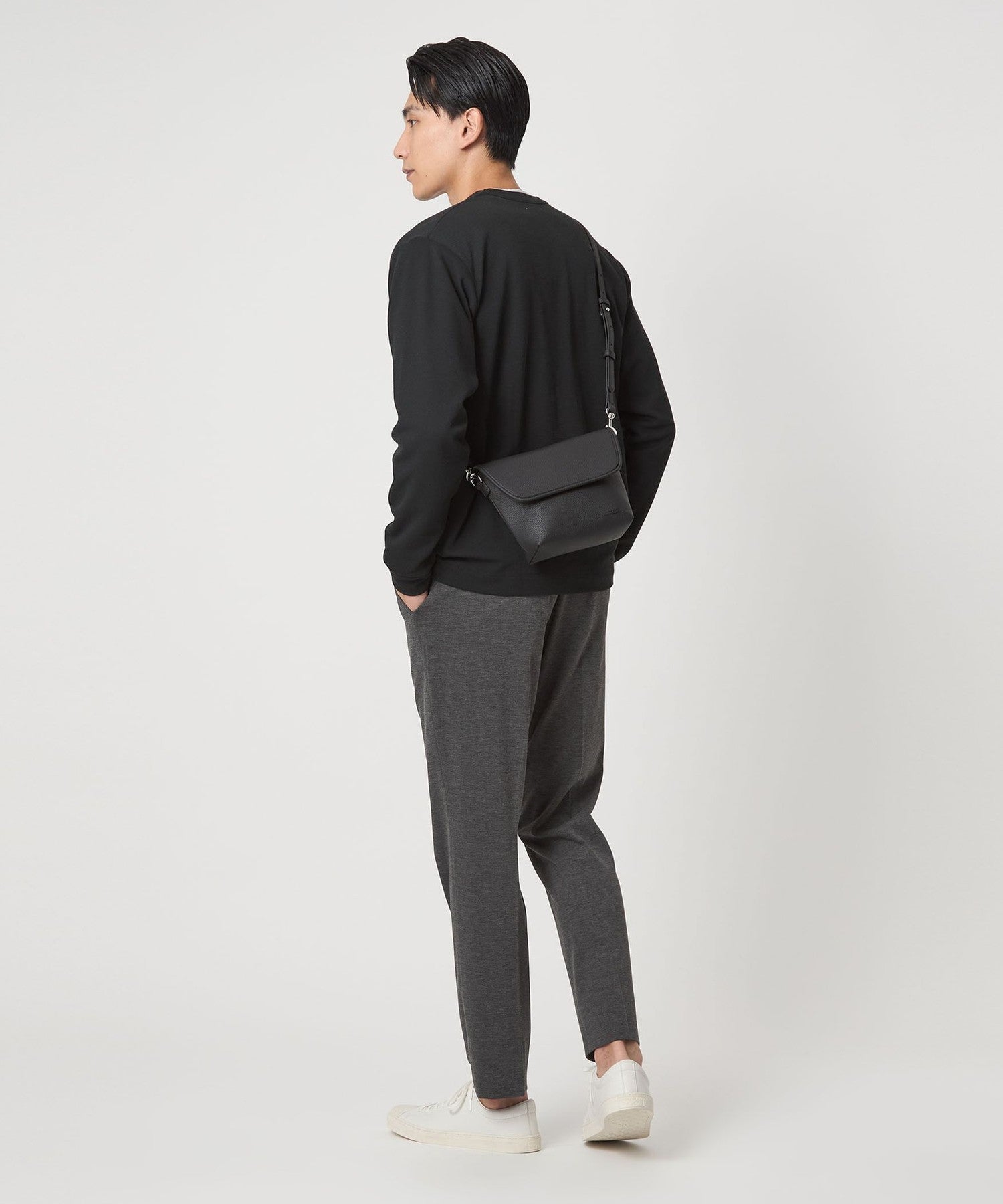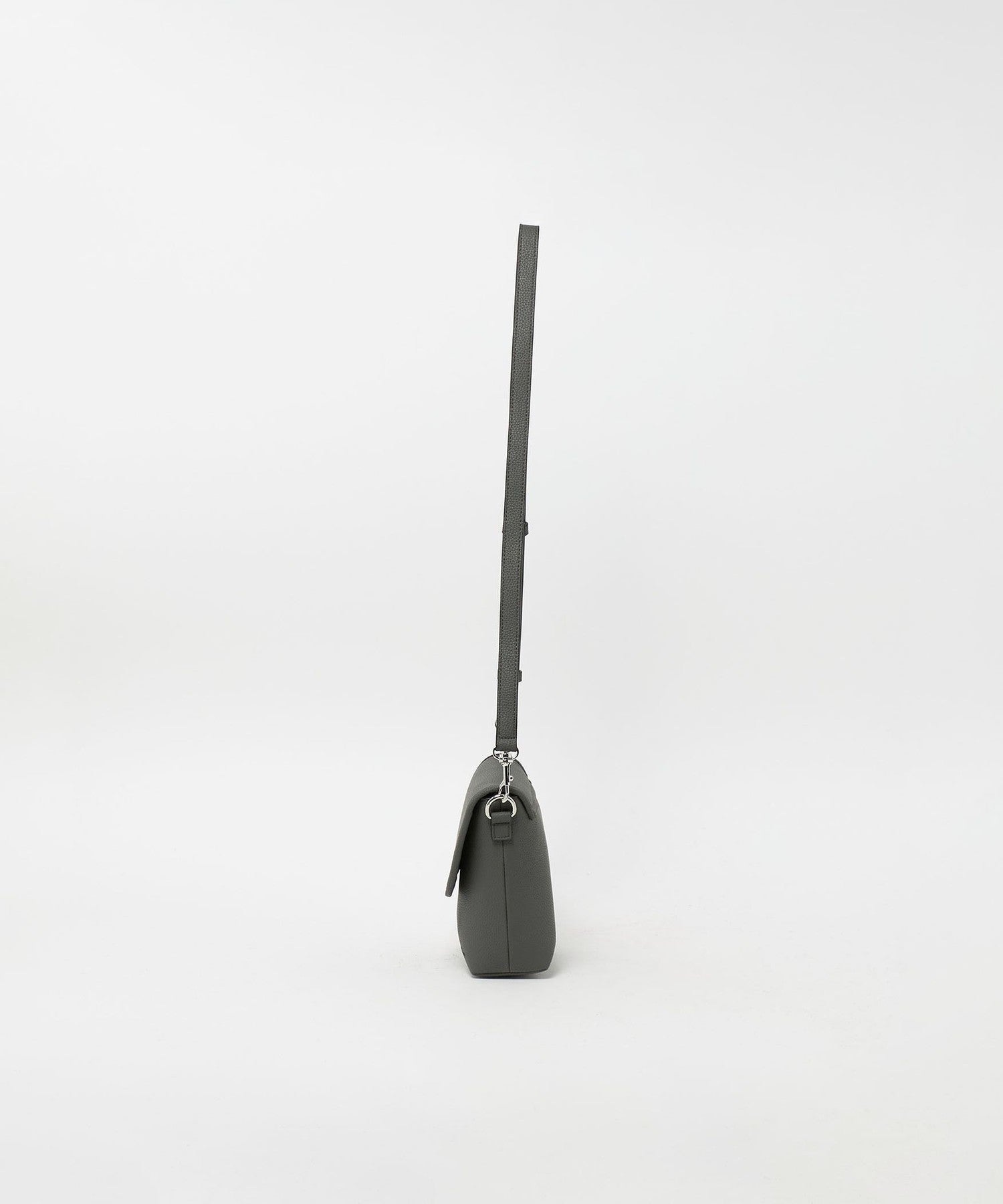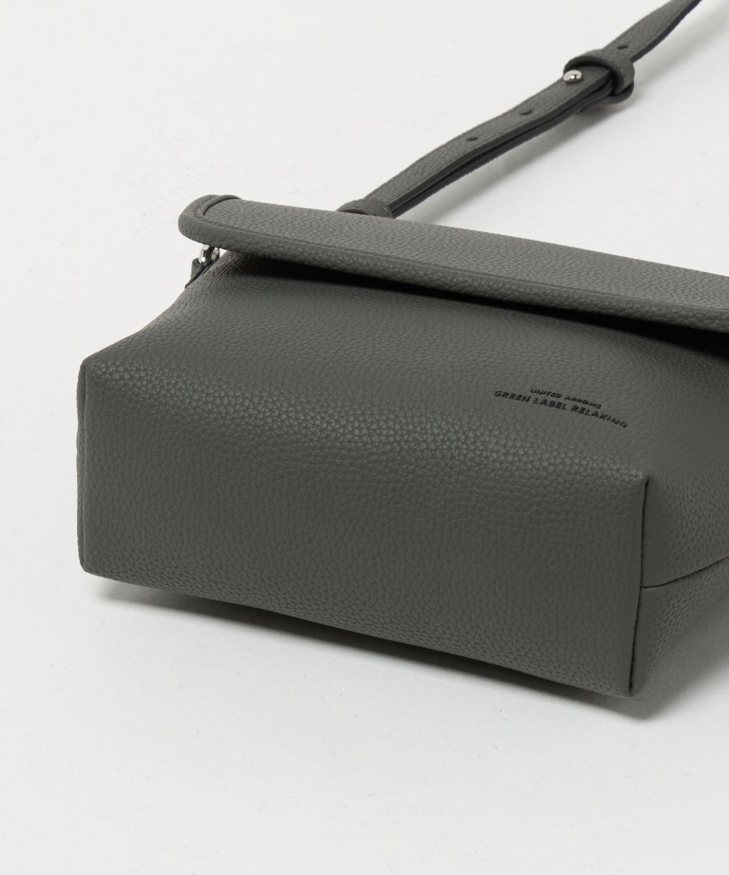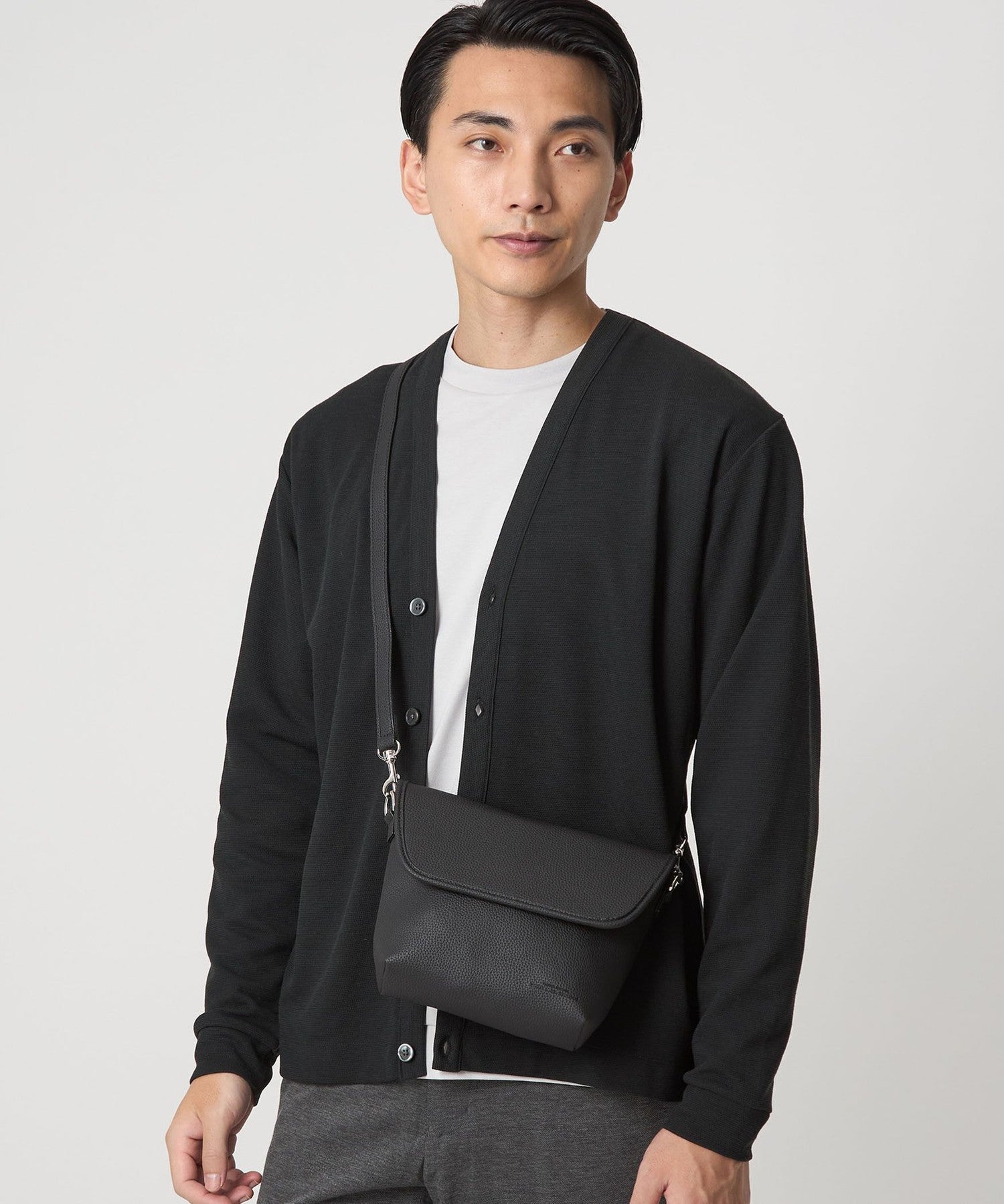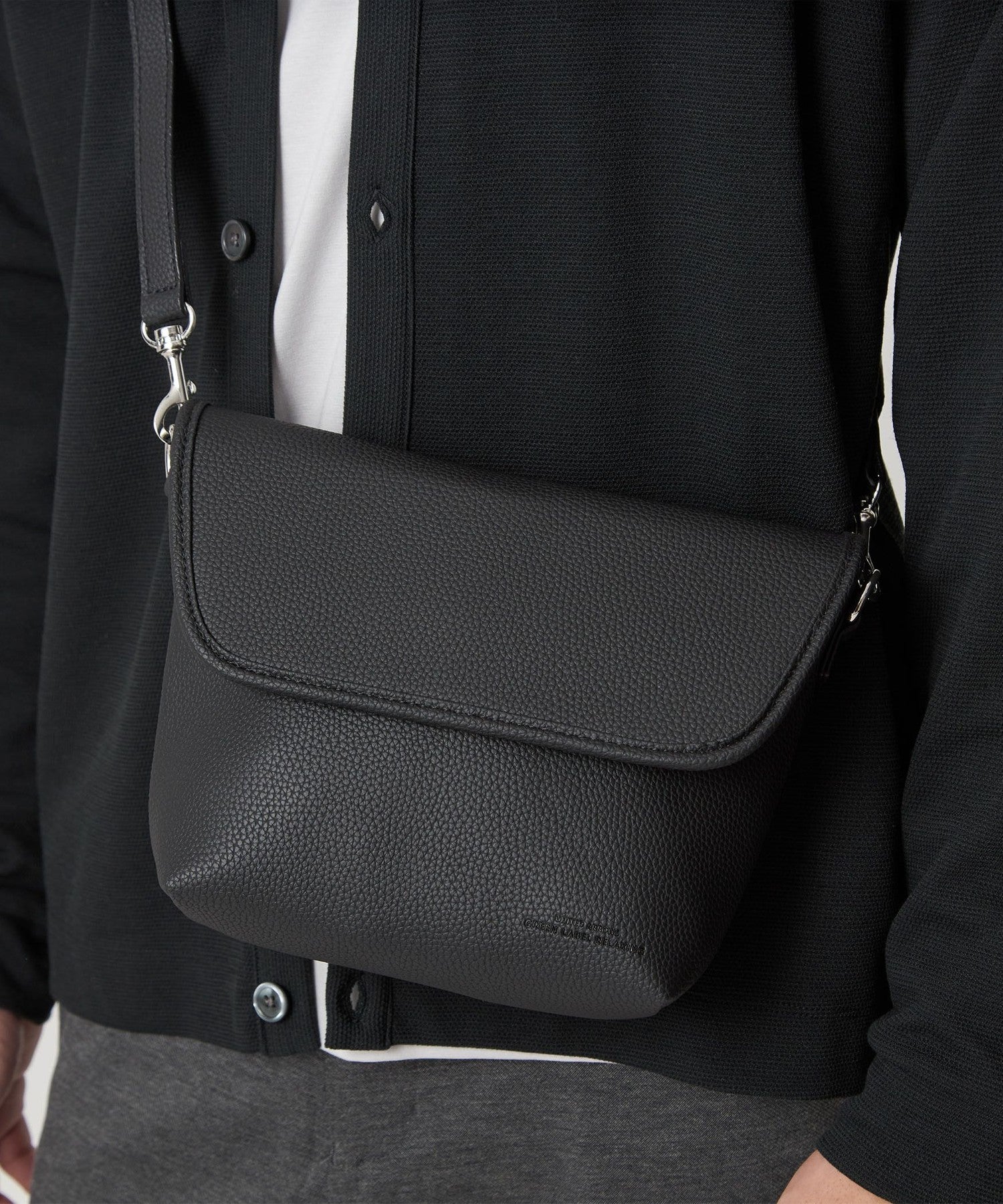 以俐落翻蓋造型設計的 顆粒壓紋PU皮革斜背包